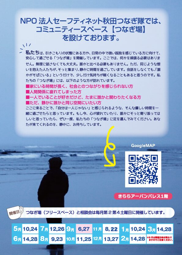 - 2025年 つなぎ場 クリスマス会のお知らせ2025年 つなぎ場クリスマス会 開催のお知らせ いつもNPO法人セーフティネット秋田つなぎ隊の活動にご理解ご協力いただき、誠にありがとうございます。 つなぎ場や相談会に来て頂いてる利用者の皆様、ご家族の皆様、地域の皆様 […]