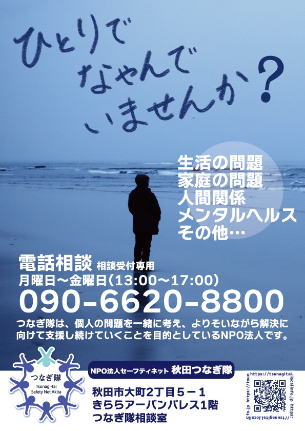 NPO法人セーフティネット秋田つなぎ隊は、「あなたの生きる支援をしたい」という強い願いのもと、生活の困難や心の苦しさを抱える方々のための