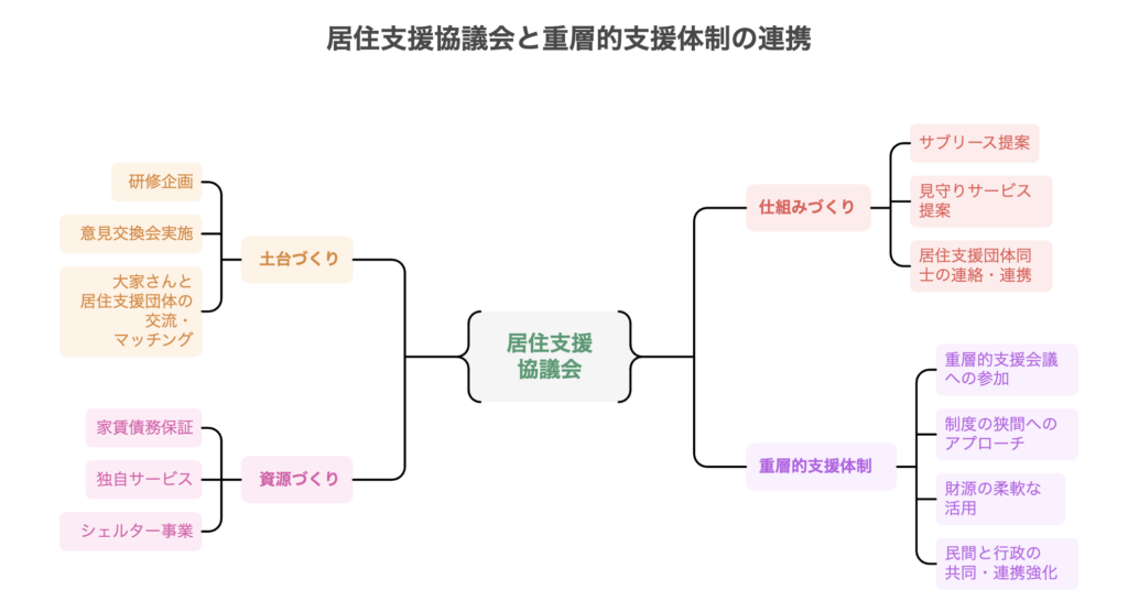 居住支援協議会行政/不動産/福祉関係者【調整プラットフォーム】 地域の居住支援体制の土台づくり、仕組みづくり、資源づくりを行う資源開発・政策調整の場NPOは資源開発(家賃保証会社との提携、死後事務の仕組み提案など)を行い、その成果を重層支援のケース会議に持ち込む。