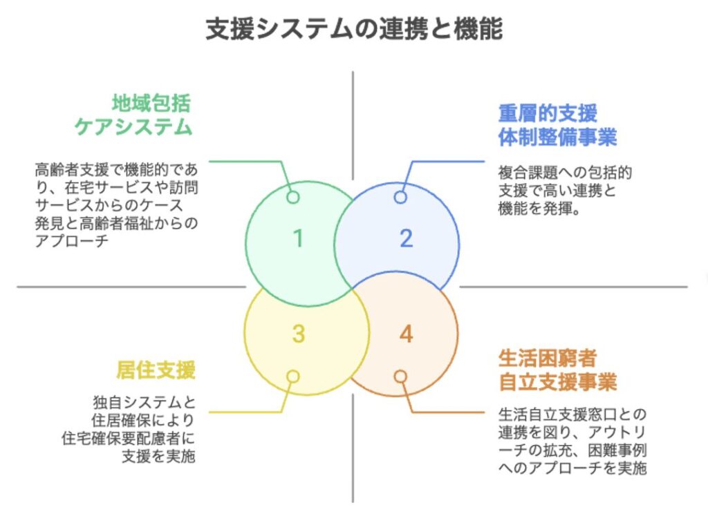 重層支援が重視する伴走支援は、対象者の課題解決に直結しなくても、そばに寄り添うことで孤立を防ぎ、関係性を作り上げていく手法です。 地域ケアシステム(地域活動支援センター)や居住支援(特に地域居住支援事業や地域定着支援)を通じて、NPOや福祉事業者が居宅における訪問等による見守り地域とのつながり促進支援を提供することは、まさにこの長期間にわたる伴走支援を具体的に実現するものです。